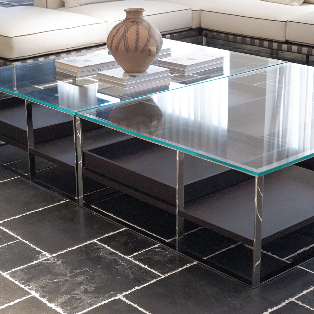 투명한 상판 아래 드러나는 절제된 구조미가 돋보이는 테이블입니다.